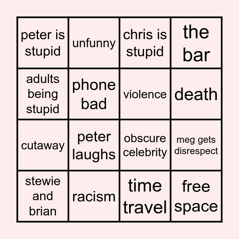 This bingo card has 16 words: racism, meg gets disrespect, chris is stupid, peter is stupid, cutaway, unfunny, obscure celebrity, time travel, adults being stupid, phone bad, stewie and brian, the bar, peter laughs, death, violence and free space.