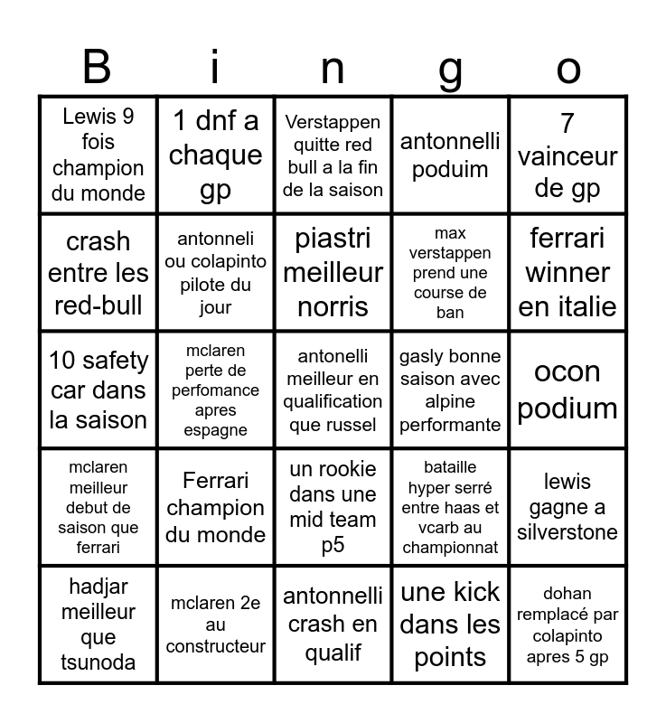This bingo card has 25 words: Ferrari champion du monde, antonnelli crash en qualif, piastri meilleur norris, hadjar meilleur que tsunoda, 7 vainceur de gp, Lewis 9 fois champion du monde, crash entre les red-bull, 1 dnf a chaque gp, gasly bonne saison avec alpine performante, un rookie dans une mid team p5, max verstappen prend une course de ban, 10 safety car dans la saison, bataille hyper serré entre haas et vcarb au championnat, lewis gagne a silverstone, antonneli ou colapinto pilote du jour, dohan remplacé par colapinto apres 5 gp, ocon podium, Verstappen quitte red bull a la fin de la saison, ferrari winner en italie, mclaren perte de perfomance apres espagne, antonelli meilleur en qualification que russel, mclaren 2e au constructeur, mclaren meilleur debut de saison que ferrari, antonnelli poduim and une kick dans les points.