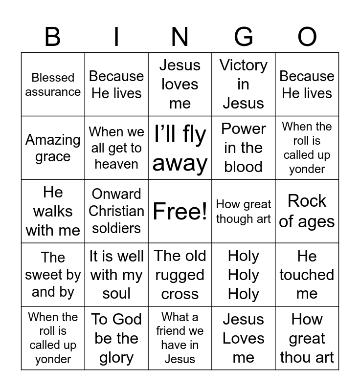 This bingo card has a free space and 29 words: When the roll is called up yonder, He touched me, Onward Christian soldiers, The old rugged cross, Blessed assurance, Jesus loves me, When we all get to heaven, It is well with my soul, How great though art, To God be the glory, Rock of ages, How great thou art, What a friend we have in Jesus, Jesus Loves me, When the roll is called up yonder, I saw the light, The old rugged cross, The sweet by and by, Because He lives, He walks with me, Holy Holy Holy, Swing low sweet chariot, Power in the blood, Amazing grace, Victory in Jesus, Because He lives, He touched me, I’ll fly away and Just as I am.