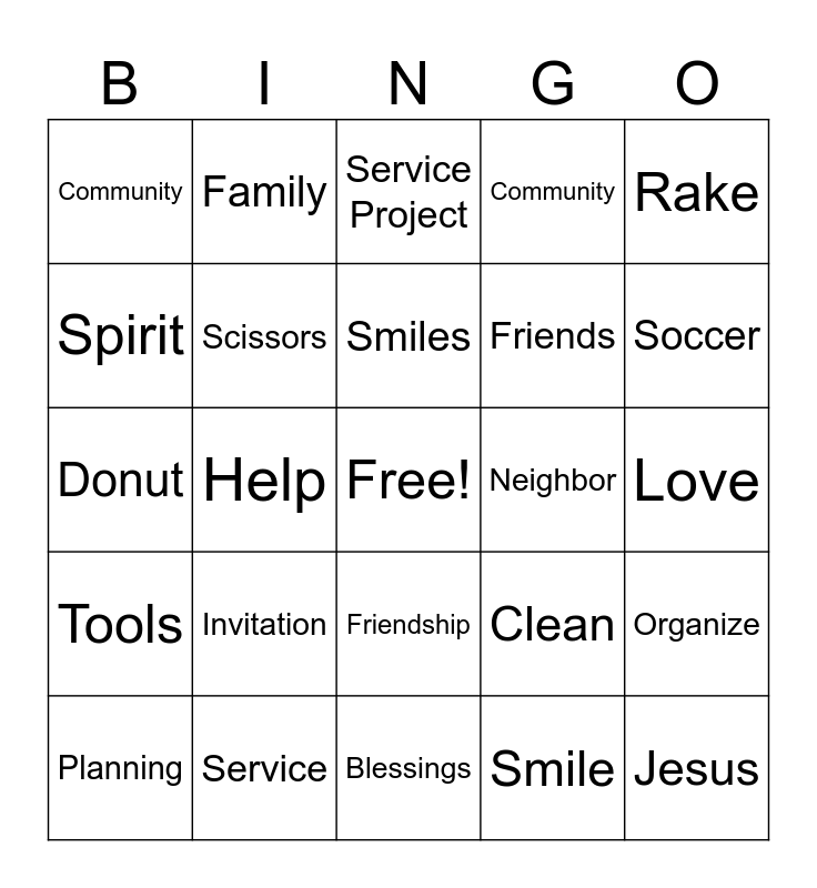 This bingo card has a free space and 30 words: Service, Plan, Help, Church, Community, Service Project, Scissors, Friendship, Neighbor, Blessings, Love, Jesus, Smile, Homework, Soccer, Park, Clean, Tools, Invitation, Rake, Donut, Chocolate, Family, Friends, Spirit, Community, Organize, Planning, Smiles and Experience.