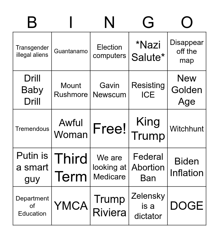 This bingo card has a free space and 24 words: Third Term, YMCA, Gavin Newscum, Department of Education, Disappear off the map, Transgender illegal aliens, Drill Baby Drill, Guantanamo, King Trump, We are looking at Medicare, Resisting ICE, Tremendous, Federal Abortion Ban, Biden Inflation, Mount Rushmore, Zelensky is a dictator, Witchhunt, Election computers, New Golden Age, Awful Woman, DOGE, Putin is a smart guy, *Nazi Salute* and Trump Riviera.