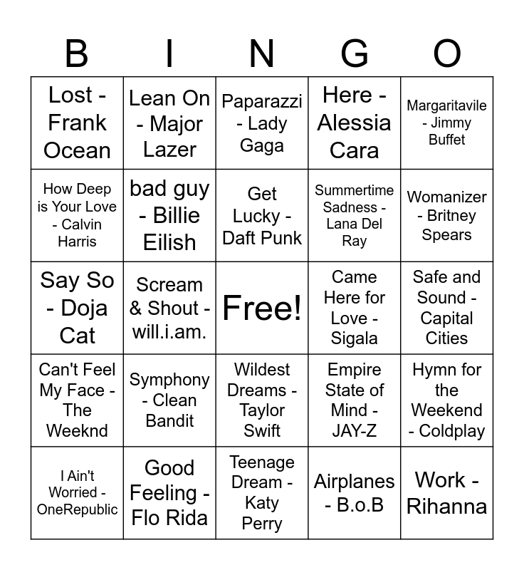 This bingo card has a free space and 24 words: Symphony - Clean Bandit, Good Feeling - Flo Rida, Get Lucky - Daft Punk, I Ain't Worried - OneRepublic, Margaritavile - Jimmy Buffet, Lost - Frank Ocean, How Deep is Your Love - Calvin Harris, Lean On - Major Lazer, Came Here for Love - Sigala, Wildest Dreams - Taylor Swift, Summertime Sadness - Lana Del Ray, Say So - Doja Cat, Empire State of Mind - JAY-Z, Hymn for the Weekend - Coldplay, bad guy - Billie Eilish, Airplanes - B.o.B, Safe and Sound - Capital Cities, Paparazzi - Lady Gaga, Womanizer - Britney Spears, Scream & Shout - will.i.am., Work - Rihanna, Can't Feel My Face - The Weeknd, Here - Alessia Cara and Teenage Dream - Katy Perry.