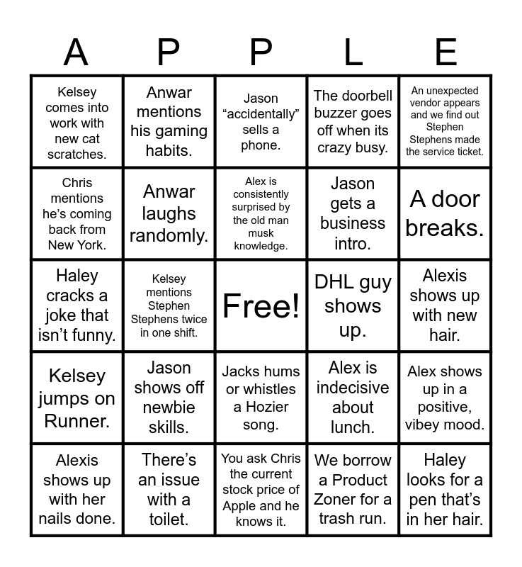 This bingo card has a free space and 27 words: Alex is indecisive about lunch., Three AVP Demos come at once., Jason gets a business intro., You ask Chris the current stock price of Apple and he knows it., Chris mentions he’s coming back from New York., Jason “accidentally” sells a phone., Anwar mentions his gaming habits., Kelsey jumps on Runner., DHL guy shows up., Alex shows up in a positive, vibey mood., Haley cracks a joke that isn’t funny., The doorbell buzzer goes off when its crazy busy., Alexis shows up with her nails done., There’s an issue with a toilet., A door breaks., Jack goes to a non-Backstager to get a laugh on a joke., Anwar laughs randomly., Alex is consistently surprised by the old man musk knowledge., Jason shows off newbie skills., Kelsey comes into work with new cat scratches., Alexis shows up with new hair., We borrow a Product Zoner for a trash run., Kelsey mentions Stephen Stephens twice in one shift., Haley looks for a pen that’s in her hair., Jacks hums or whistles a Hozier song., An unexpected vendor appears and we find out Stephen Stephens made the service ticket. and We get a delivery driver who acts hard but is super chill..