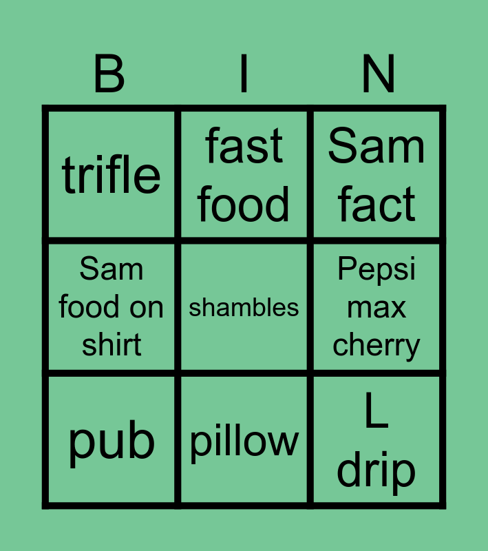 This bingo card has a free space and 8 words: Pepsi max cherry, Sam fact, fast food, pub, trifle, L drip, Sam food on shirt and pillow.
