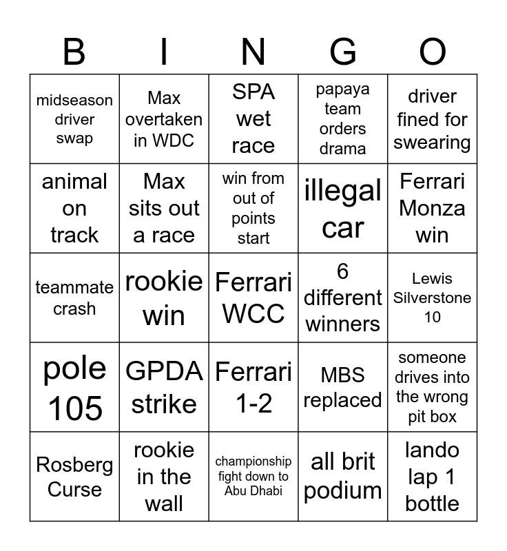 This bingo card has a free space and 24 words: GPDA strike, rookie in the wall, win from out of points start, Rosberg Curse, driver fined for swearing, midseason driver swap, animal on track, Max overtaken in WDC, 6 different winners, Ferrari 1-2, illegal car, teammate crash, MBS replaced, someone drives into the wrong pit box, Max sits out a race, all brit podium, Lewis Silverstone 10, SPA wet race, Ferrari Monza win, rookie win, lando lap 1 bottle, pole 105, papaya team orders drama and championship fight down to Abu Dhabi.