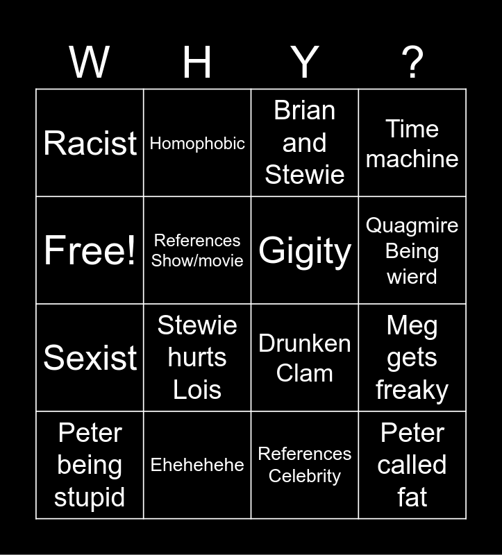 This bingo card has 16 words: Ehehehehe, Meg gets freaky, Brian and Stewie, Racist, Sexist, Homophobic, Drunken Clam, References Celebrity, Free!, References Show/movie, Peter being stupid, Time machine, Stewie hurts Lois, Quagmire Being wierd, Gigity and Peter called fat.