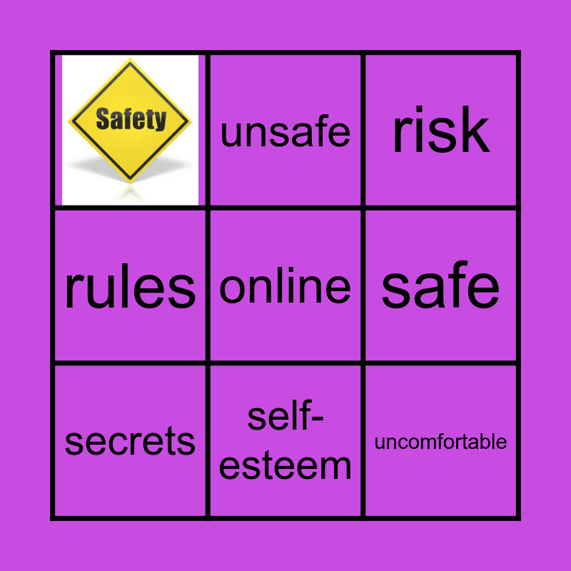 This bingo card has 1 images and 8 words: secrets, risk, unsafe, rules, safe, online, uncomfortable and self-esteem.