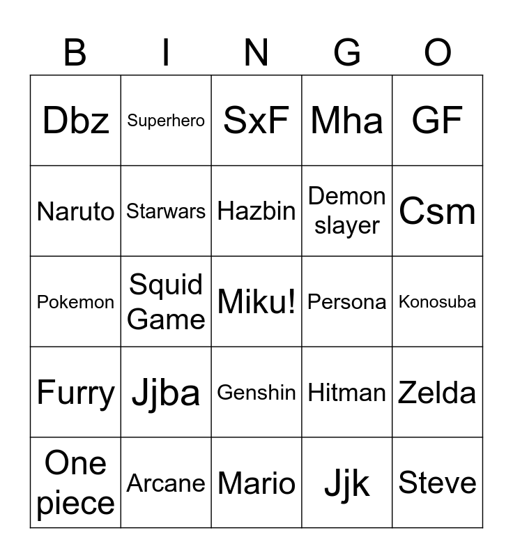 This bingo card has a free space and 24 words: Jjba, Arcane, Hazbin, One piece, GF, Dbz, Naruto, Superhero, Persona, Genshin, Demon slayer, Pokemon, Hitman, Zelda, Starwars, Jjk, Konosuba, SxF, Csm, Squid Game, Steve, Furry, Mha and Mario.