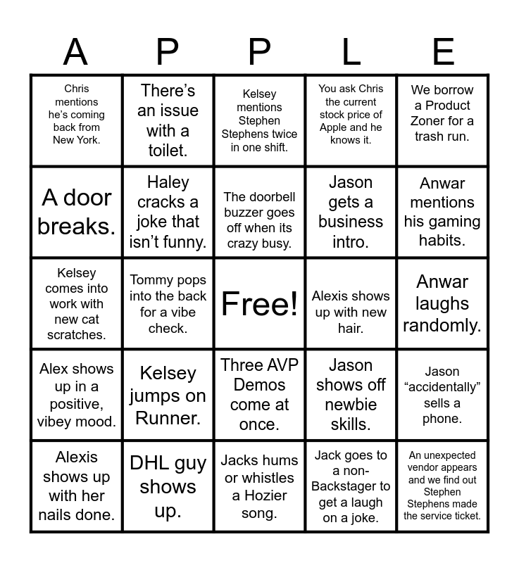 This bingo card has a free space and 24 words: Kelsey jumps on Runner., DHL guy shows up., The doorbell buzzer goes off when its crazy busy., Alexis shows up with her nails done., We borrow a Product Zoner for a trash run., Chris mentions he’s coming back from New York., A door breaks., There’s an issue with a toilet., Alexis shows up with new hair., Three AVP Demos come at once., Jason gets a business intro., Kelsey comes into work with new cat scratches., Jason shows off newbie skills., Jason “accidentally” sells a phone., Haley cracks a joke that isn’t funny., Jack goes to a non-Backstager to get a laugh on a joke., Anwar laughs randomly., Kelsey mentions Stephen Stephens twice in one shift., Anwar mentions his gaming habits., Tommy pops into the back for a vibe check., An unexpected vendor appears and we find out Stephen Stephens made the service ticket., Alex shows up in a positive, vibey mood., You ask Chris the current stock price of Apple and he knows it. and Jacks hums or whistles a Hozier song..
