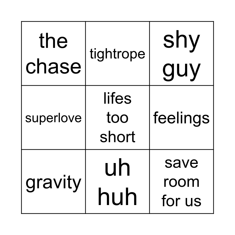 This bingo card has a free space and 8 words: feelings, shy guy, tightrope, gravity, the chase, save room for us, superlove and uh huh.