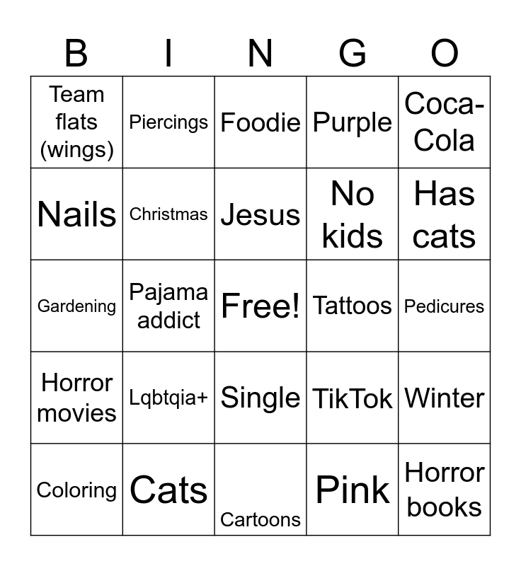 This bingo card has a free space and 24 words: Lqbtqia+, Cats, Jesus, Coloring, Coca-Cola, Team flats (wings), Nails, Piercings, Tattoos, Single, No kids, Gardening, TikTok, Winter, Christmas, Pink, Pedicures, Foodie, Has cats, Pajama addict, Horror books, Horror movies, Purple and Cartoons.