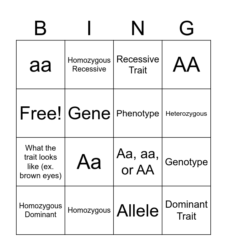 This bingo card has 16 words: Homozygous, Genotype, Recessive Trait, aa, What the trait looks like (ex. brown eyes), Homozygous Recessive, Aa, aa, or AA, Allele, Free!, Gene, Homozygous Dominant, AA, Aa, Heterozygous, Phenotype and Dominant Trait.