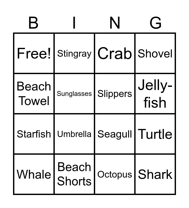 This bingo card has 16 words: Whale, Beach Shorts, Crab, Shovel, Beach Towel, Stingray, Seagull, Turtle, Free!, Sunglasses, Octopus, Jelly-fish, Starfish, Umbrella, Slippers and Shark.