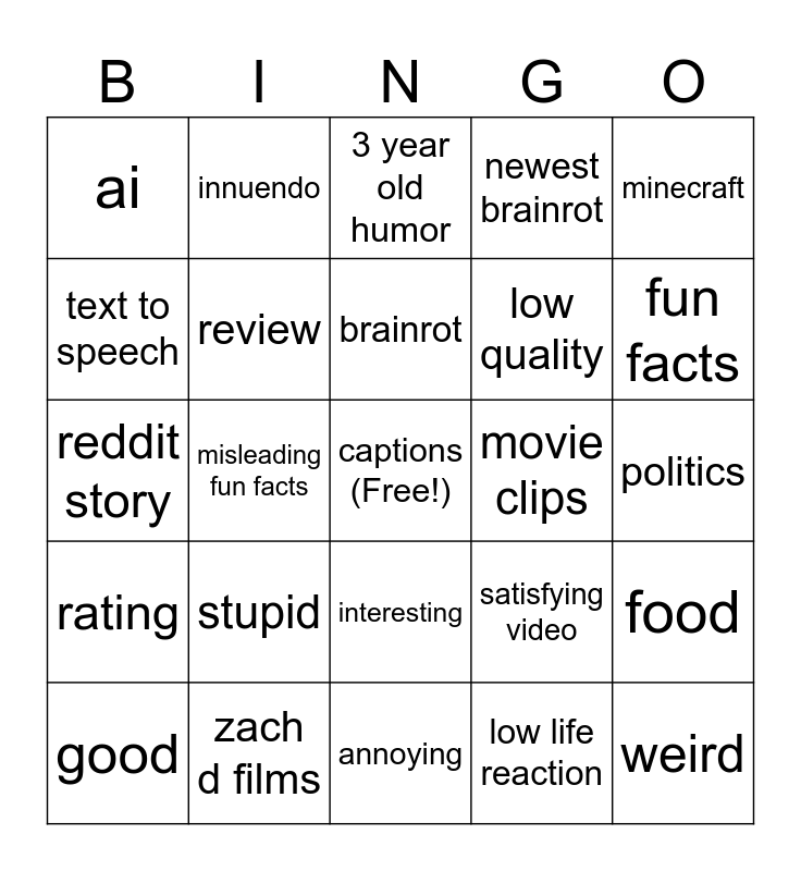 This bingo card has a free space and 24 words: stupid, zach d films, brainrot, good, minecraft, ai, text to speech, innuendo, movie clips, interesting, low quality, reddit story, satisfying video, food, review, low life reaction, politics, 3 year old humor, fun facts, misleading fun facts, weird, rating, newest brainrot and annoying.