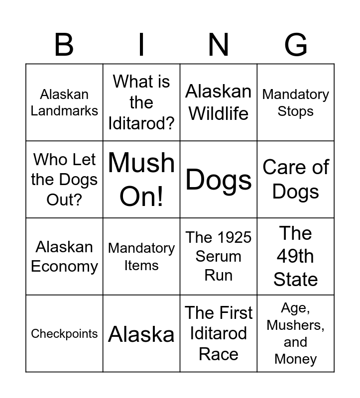 This bingo card has 16 words: Alaska, The 49th State, Alaskan Wildlife, Alaskan Landmarks, Alaskan Economy, What is the Iditarod?, The 1925 Serum Run, The First Iditarod Race, Who Let the Dogs Out?, Mush On!, Checkpoints, Mandatory Stops, Mandatory Items, Care of Dogs, Dogs and Age, Mushers, and Money.