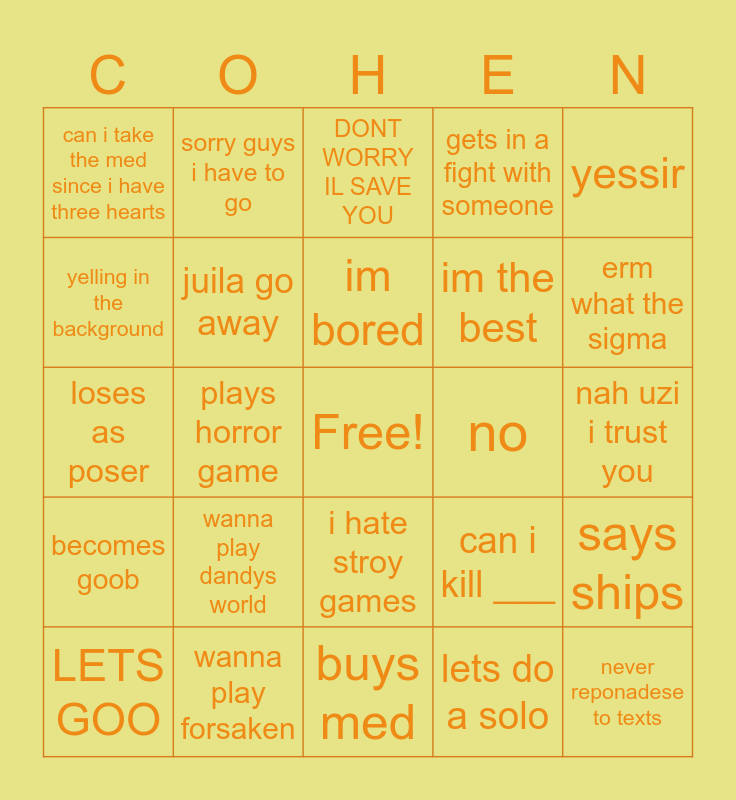 This bingo card has a free space and 24 words: wanna play dandys world, wanna play forsaken, im bored, LETS GOO, yessir, can i take the med since i have three hearts, yelling in the background, sorry guys i have to go, no, i hate stroy games, im the best, loses as poser, can i kill ___, says ships, juila go away, lets do a solo, nah uzi i trust you, DONT WORRY IL SAVE YOU, erm what the sigma, plays horror game, never reponadese to texts, becomes goob, gets in a fight with someone and buys med.