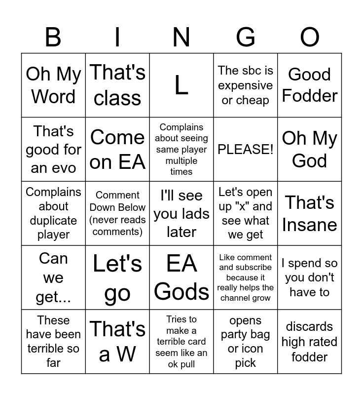 This bingo card has a free space and 24 words: Let's go, That's a W, Complains about seeing same player multiple times, These have been terrible so far, Good Fodder, Oh My Word, That's good for an evo, That's class, Let's open up "x" and see what we get, EA Gods, PLEASE!, Complains about duplicate player, Like comment and subscribe because it really helps the channel grow, I spend so you don't have to, Come on EA, opens party bag or icon pick, That's Insane, L, Oh My God, Comment Down Below (never reads comments), discards high rated fodder, Can we get..., The sbc is expensive or cheap and Tries to make a terrible card seem like an ok pull.