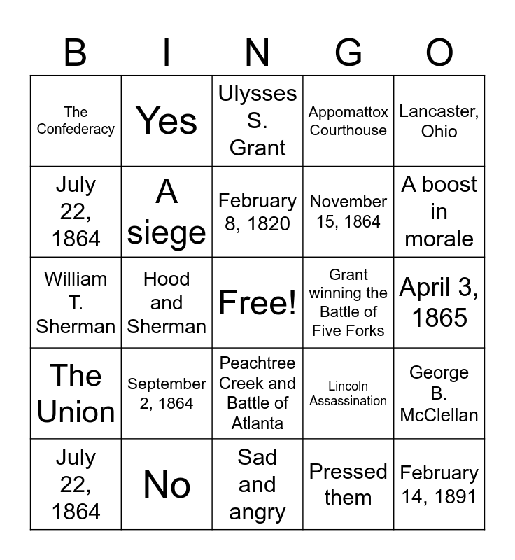 This bingo card has a free space and 25 words: The Union, No, Sad and angry, Pressed them, Lancaster, Ohio, The Confederacy, Yes, Ulysses S. Grant, Grant winning the Battle of Five Forks, George B. McClellan, July 22, 1864, A siege, Seven Days’ Battle, Lincoln Assassination, A boost in morale, July 22, 1864, Hood and Sherman, February 8, 1820, November 15, 1864, April 3, 1865, William T. Sherman, September 2, 1864, Peachtree Creek and Battle of Atlanta, Appomattox Courthouse and February 14, 1891.