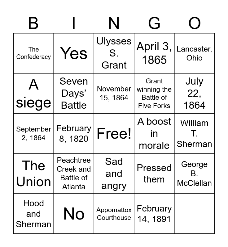 This bingo card has a free space and 24 words: The Union, No, Sad and angry, Pressed them, Lancaster, Ohio, The Confederacy, Yes, Ulysses S. Grant, Grant winning the Battle of Five Forks, George B. McClellan, A siege, Seven Days’ Battle, Lincoln Assassination, A boost in morale, July 22, 1864, Hood and Sherman, February 8, 1820, November 15, 1864, April 3, 1865, William T. Sherman, September 2, 1864, Peachtree Creek and Battle of Atlanta, Appomattox Courthouse and February 14, 1891.