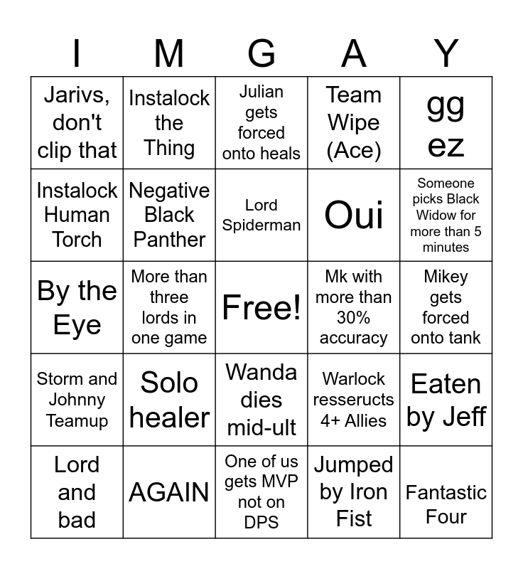 This bingo card has a free space and 24 words: Solo healer, AGAIN, Lord Spiderman, Lord and bad, gg ez, Jarivs, don't clip that, Instalock Human Torch, Instalock the Thing, Mk with more than 30% accuracy, Wanda dies mid-ult, Oui, By the Eye, Warlock resseructs 4+ Allies, Eaten by Jeff, Negative Black Panther, Jumped by Iron Fist, Mikey gets forced onto tank, Julian gets forced onto heals, Someone picks Black Widow for more than 5 minutes, More than three lords in one game, Fantastic Four, Storm and Johnny Teamup, Team Wipe (Ace) and One of us gets MVP not on DPS.