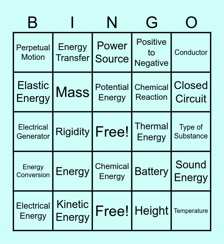 This bingo card has a free space and 24 words: Energy, Kinetic Energy, Potential Energy, Electrical Energy, Conductor, Perpetual Motion, Elastic Energy, Energy Transfer, Thermal Energy, Chemical Energy, Chemical Reaction, Electrical Generator, Battery, Sound Energy, Mass, Height, Type of Substance, Power Source, Closed Circuit, Rigidity, Temperature, Energy Conversion, Positive to Negative and Free!.