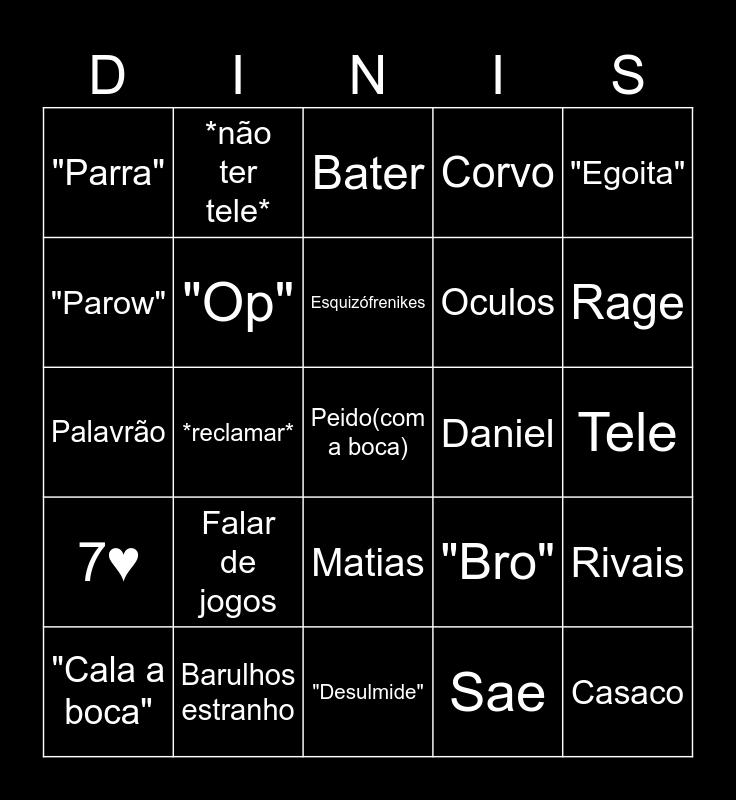 This bingo card has 25 words: Falar de jogos, "Desulmide", Esquizófrenikes, "Cala a boca", "Egoita", "Parra", "Parow", *não ter tele*, Daniel, Matias, Oculos, Palavrão, "Bro", Rivais, "Op", Casaco, Tele, Bater, Rage, *reclamar*, Peido(com a boca), Barulhos estranho, 7♥︎, Corvo and Sae.
