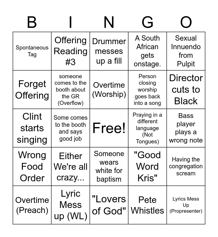 This bingo card has a free space and 24 words: Either We're all crazy..., Lyric Mess up (WL), Overtime (Worship), Overtime (Preach), Sexual Innuendo from Pulpit, Spontaneous Tag, Forget Offering, Offering Reading #3, Praying in a different language (Not Tongues), Someone wears white for baptism, Person closing worship goes back into a song, Clint starts singing, "Good Word Kris", Having the congregation scream, someone comes to the booth about the GR (Overflow), Pete Whistles, Bass player plays a wrong note, Drummer messes up a fill, Director cuts to Black, Some comes to the booth and says good job, Lyrics Mess Up (Propresenter), Wrong Food Order, A South African gets onstage. and "Lovers of God".