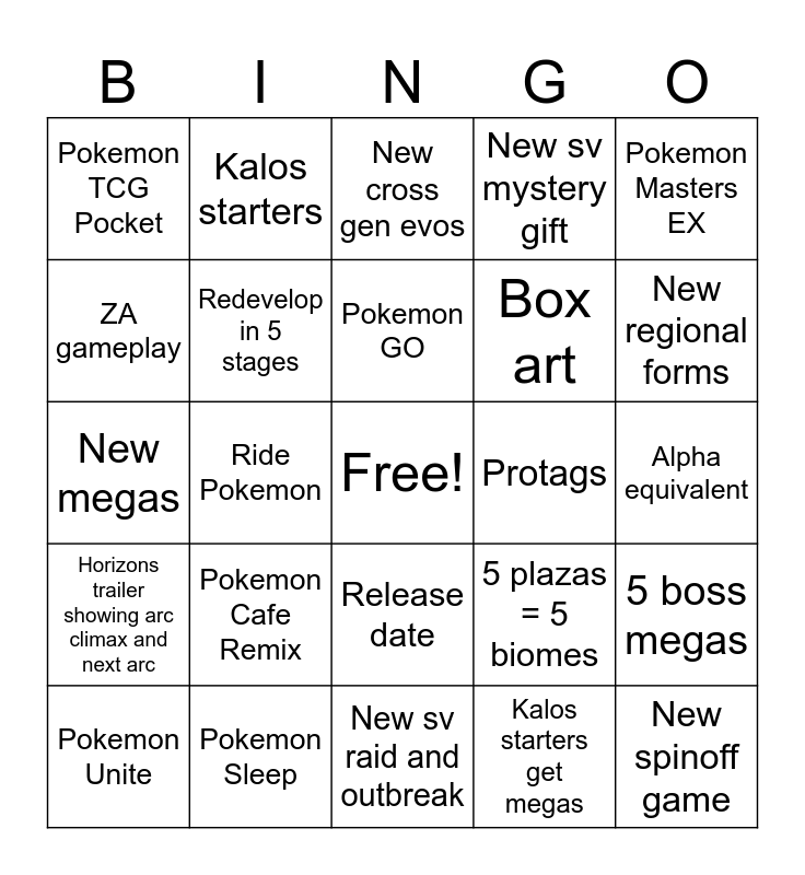 This bingo card has a free space and 24 words: Pokemon Cafe Remix, Pokemon Sleep, Pokemon GO, Pokemon Unite, Pokemon Masters EX, Pokemon TCG Pocket, ZA gameplay, Kalos starters, Protags, Release date, Box art, New megas, 5 plazas = 5 biomes, 5 boss megas, Redevelop in 5 stages, Kalos starters get megas, Alpha equivalent, New cross gen evos, New regional forms, Ride Pokemon, New spinoff game, Horizons trailer showing arc climax and next arc, New sv mystery gift and New sv raid and outbreak.