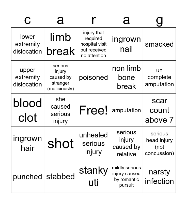 This bingo card has a free space and 24 words: shot, stabbed, poisoned, punched, smacked, lower extremity dislocation, upper extremity dislocation, limb break, amputation, unhealed serious injury, non limb bone break, blood clot, serious injury caused by relative, serious head injury (not concussion), serious injury caused by stranger (maliciously), mildly serious injury caused by romantic pursuit, scar count above 7, injury that required hospital visit but received no attention, un complete amputation, she caused serious injury, narsty infection, ingrown hair, ingrown nail and stanky uti.