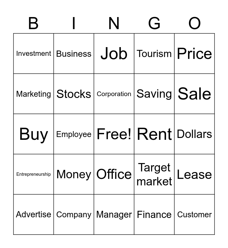 This bingo card has a free space and 24 words: Money, Company, Corporation, Advertise, Price, Investment, Marketing, Business, Rent, Office, Saving, Buy, Target market, Lease, Stocks, Finance, Dollars, Job, Sale, Employee, Customer, Entrepreneurship, Tourism and Manager.