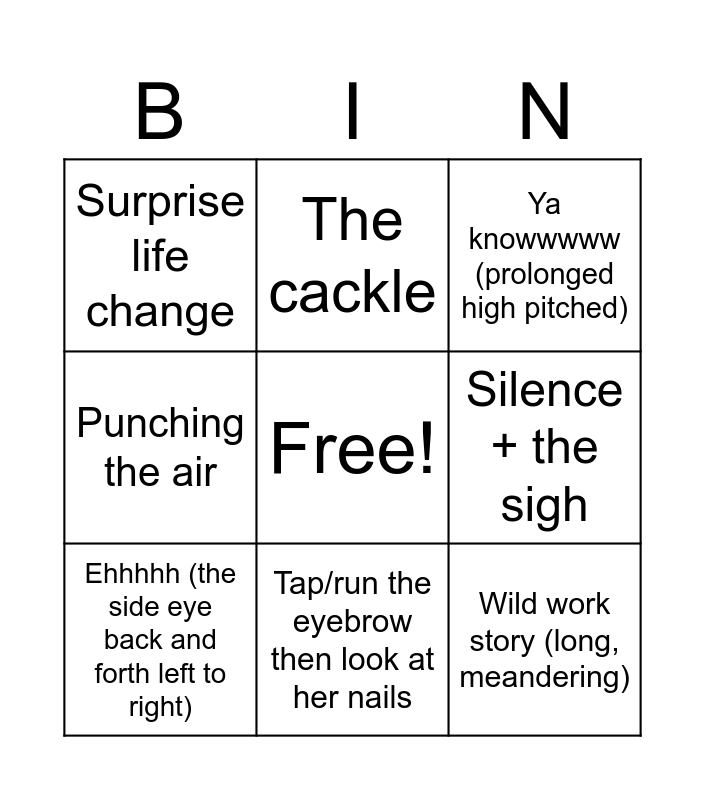 This bingo card has a free space and 8 words: Silence + the sigh, Ya knowwwww (prolonged high pitched), The cackle, Ehhhhh (the side eye back and forth left to right), Surprise life change, Wild work story (long, meandering), Punching the air and Tap/run the eyebrow then look at her nails.