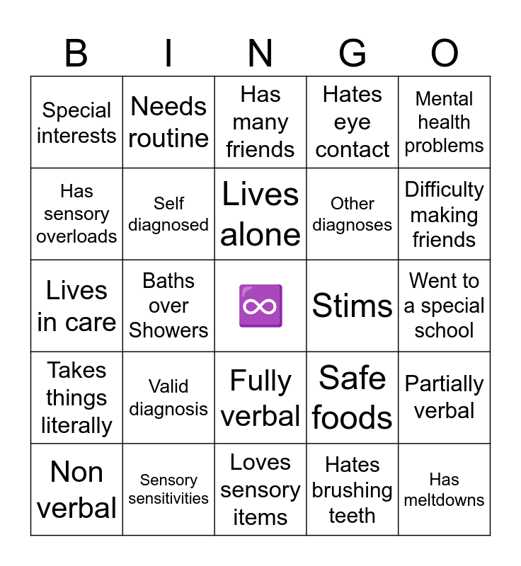 This bingo card has a free space and 24 words: Valid diagnosis, Sensory sensitivities, Lives alone, Non verbal, Mental health problems, Special interests, Has sensory overloads, Needs routine, Stims, Fully verbal, Other diagnoses, Lives in care, Safe foods, Partially verbal, Self diagnosed, Hates brushing teeth, Went to a special school, Has many friends, Difficulty making friends, Baths over Showers, Has meltdowns, Takes things literally, Hates eye contact and Loves sensory items.
