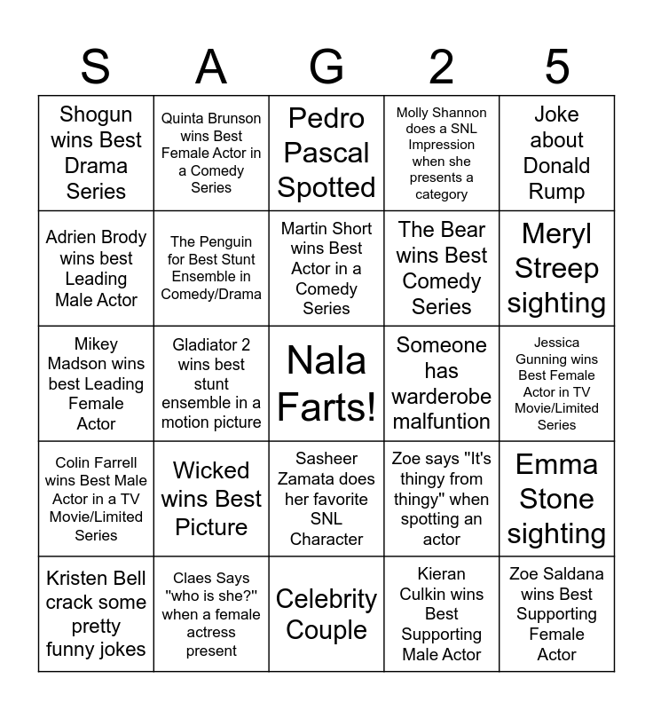 This bingo card has a free space and 24 words: Wicked wins Best Picture, Claes Says ''who is she?'' when a female actress present, Martin Short wins Best Actor in a Comedy Series, Kristen Bell crack some pretty funny jokes, Joke about Donald Rump, Shogun wins Best Drama Series, Adrien Brody wins best Leading Male Actor, Quinta Brunson wins Best Female Actor in a Comedy Series, Someone has warderobe malfuntion, Sasheer Zamata does her favorite SNL Character, The Bear wins Best Comedy Series, Mikey Madson wins best Leading Female Actor, Zoe says ''It's thingy from thingy'' when spotting an actor, Emma Stone sighting, The Penguin for Best Stunt Ensemble in Comedy/Drama, Kieran Culkin wins Best Supporting Male Actor, Jessica Gunning wins Best Female Actor in TV Movie/Limited Series, Pedro Pascal Spotted, Meryl Streep sighting, Gladiator 2 wins best stunt ensemble in a motion picture, Zoe Saldana wins Best Supporting Female Actor, Colin Farrell wins Best Male Actor in a TV Movie/Limited Series, Molly Shannon does a SNL Impression when she presents a category and Celebrity Couple.