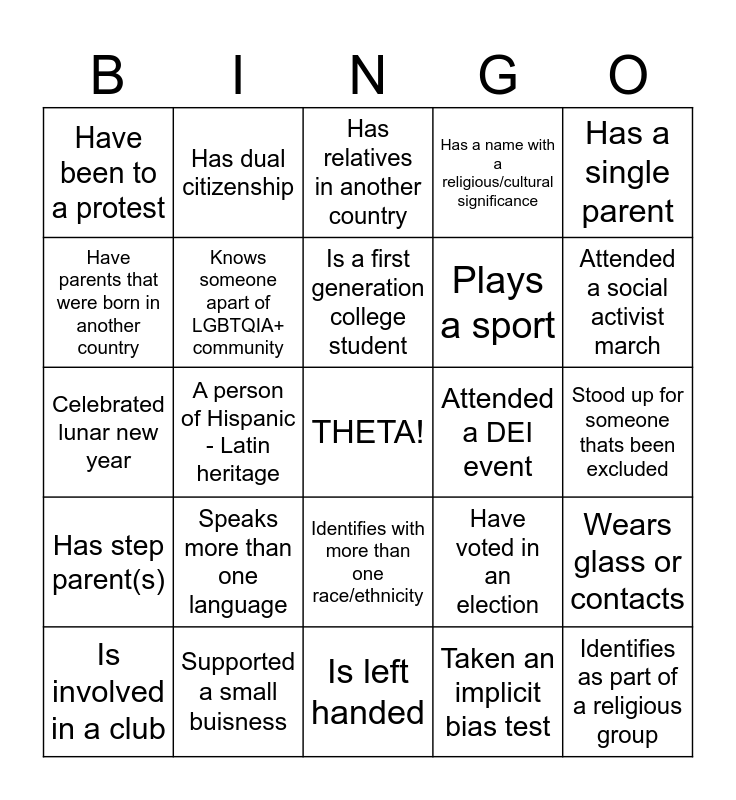 This bingo card has a free space and 24 words: Speaks more than one language, Supported a small buisness, Is a first generation college student, Is involved in a club, Has a single parent, Have been to a protest, Have parents that were born in another country, Has dual citizenship, Attended a DEI event, Identifies with more than one race/ethnicity, Plays a sport, Celebrated lunar new year, Have voted in an election, Wears glass or contacts, Knows someone apart of LGBTQIA+ community, Taken an implicit bias test, Stood up for someone thats been excluded, Has relatives in another country, Attended a social activist march, A person of Hispanic - Latin heritage, Identifies as part of a religious group, Has step parent(s), Has a name with a religious/cultural significance and Is left handed.