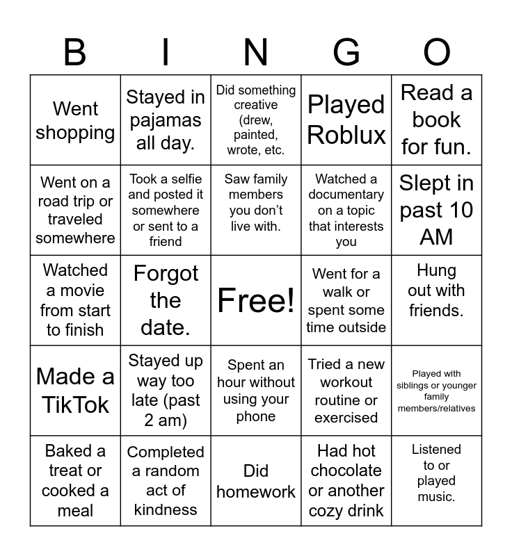 This bingo card has a free space and 24 words: Stayed up way too late (past 2 am), Completed a random act of kindness, Saw family members you don’t live with., Baked a treat or cooked a meal, Read a book for fun., Went shopping, Went on a road trip or traveled somewhere, Stayed in pajamas all day., Went for a walk or spent some time outside, Spent an hour without using your phone, Watched a documentary on a topic that interests you, Watched a movie from start to finish, Tried a new workout routine or exercised, Played with siblings or younger family members/relatives, Took a selfie and posted it somewhere or sent to a friend, Had hot chocolate or another cozy drink, Hung out with friends., Did something creative (drew, painted, wrote, etc., Slept in past 10 AM, Forgot the date., Listened to or played music., Made a TikTok, Played Roblux and Did homework.