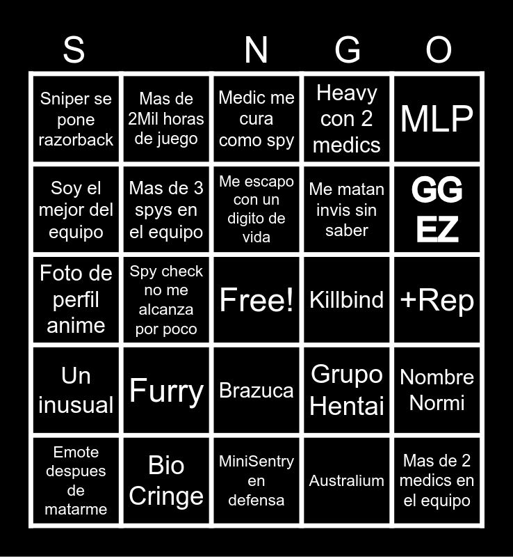 This bingo card has a free space and 24 words: Furry, Bio Cringe, Me escapo con un digito de vida, Emote despues de matarme, MLP, Sniper se pone razorback, Soy el mejor del equipo, Mas de 2Mil horas de juego, Killbind, Brazuca, Me matan invis sin saber, Foto de perfil anime, Grupo Hentai, Nombre Normi, Mas de 3 spys en el equipo, Australium, +Rep, Medic me cura como spy, GG EZ, Spy check no me alcanza por poco, Mas de 2 medics en el equipo, Un inusual, Heavy con 2 medics and MiniSentry en defensa.