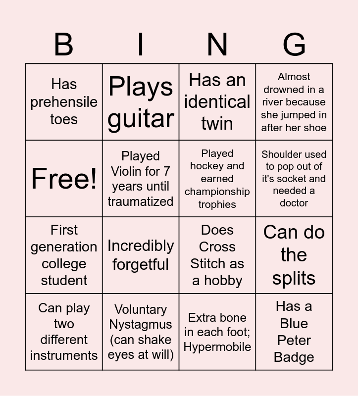 This bingo card has 16 words: Voluntary Nystagmus (can shake eyes at will), Can do the splits, Has an identical twin, Has prehensile toes, First generation college student, Plays guitar, Does Cross Stitch as a hobby, Extra bone in each foot; Hypermobile, Free!, Played Violin for 7 years until traumatized, Can play two different instruments, Almost drowned in a river because she jumped in after her shoe, Incredibly forgetful, Shoulder used to pop out of it's socket and needed a doctor, Played hockey and earned championship trophies and Has a Blue Peter Badge.