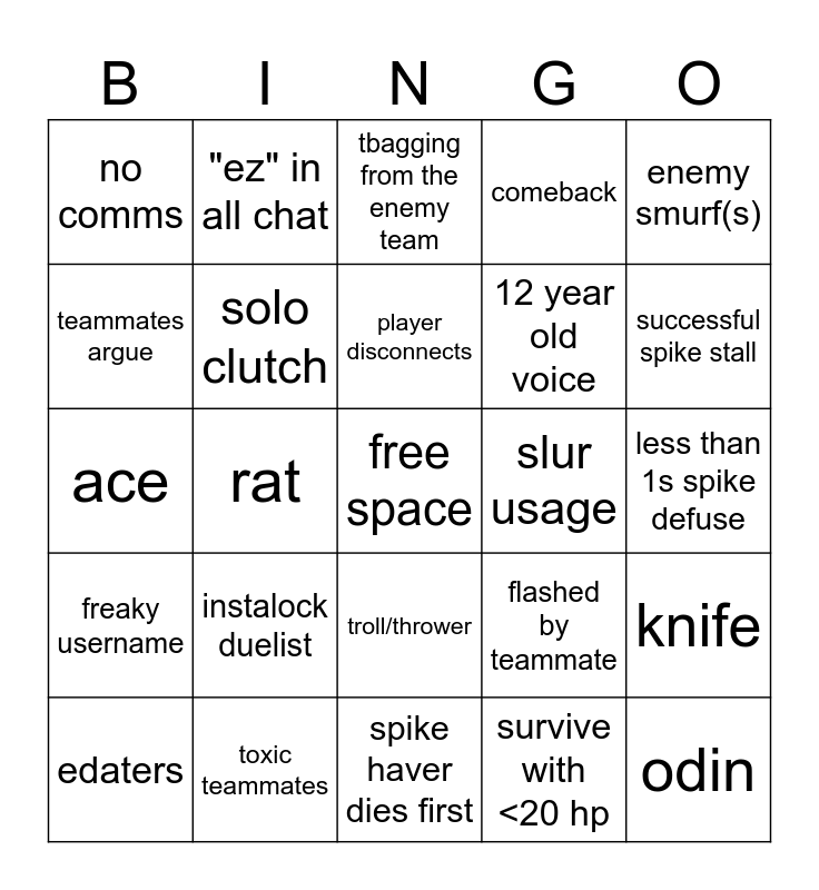 This bingo card has a free space and 24 words: instalock duelist, toxic teammates, player disconnects, edaters, enemy smurf(s), no comms, teammates argue, "ez" in all chat, slur usage, troll/thrower, 12 year old voice, ace, flashed by teammate, knife, solo clutch, survive with <20 hp, less than 1s spike defuse, tbagging from the enemy team, successful spike stall, rat, odin, freaky username, comeback and spike haver dies first.