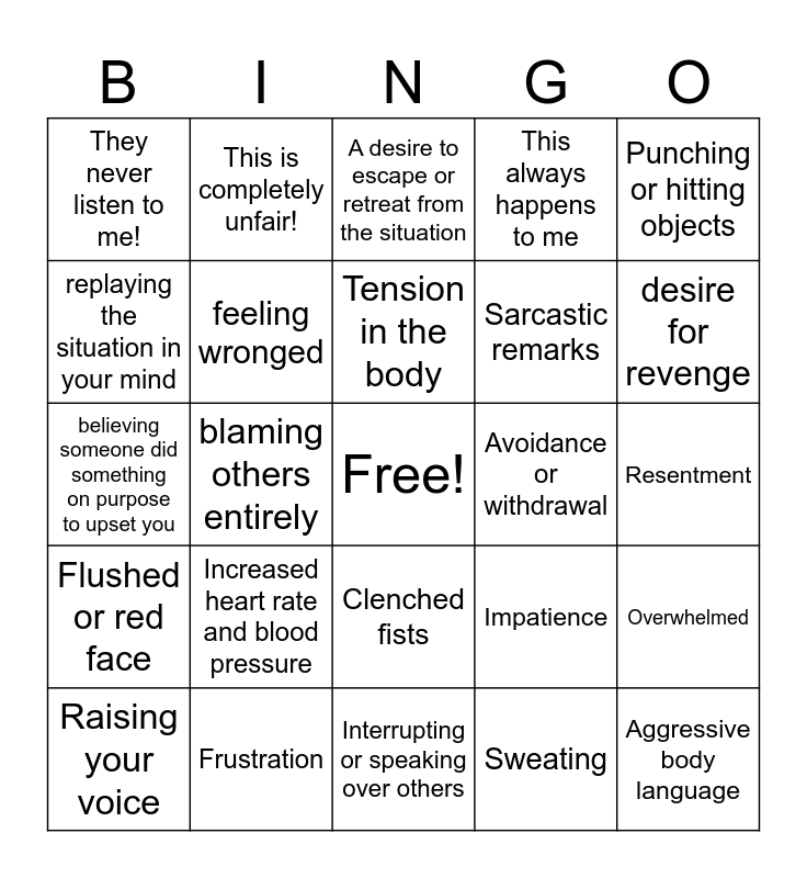 This bingo card has a free space and 24 words: Increased heart rate and blood pressure, Frustration, Tension in the body, Raising your voice, Punching or hitting objects, They never listen to me!, replaying the situation in your mind, This is completely unfair!, Avoidance or withdrawal, Clenched fists, Sarcastic remarks, believing someone did something on purpose to upset you, Impatience, Overwhelmed, feeling wronged, Sweating, Resentment, A desire to escape or retreat from the situation, desire for revenge, blaming others entirely, Aggressive body language, Flushed or red face, This always happens to me and Interrupting or speaking over others.