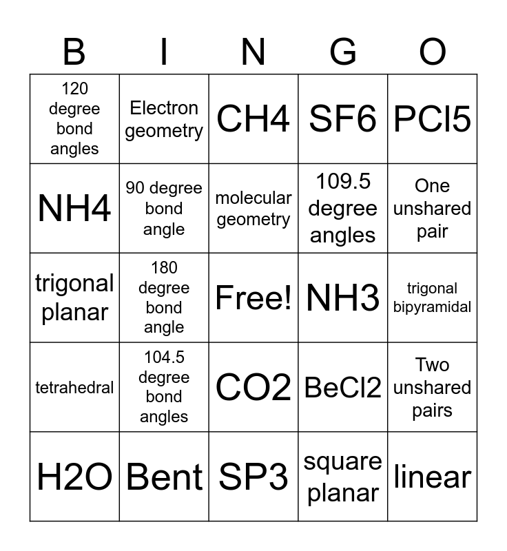 This bingo card has a free space and 24 words: 104.5 degree bond angles, Bent, molecular geometry, H2O, PCl5, 120 degree bond angles, NH4, Electron geometry, NH3, CO2, 109.5 degree angles, trigonal planar, BeCl2, Two unshared pairs, 90 degree bond angle, square planar, trigonal bipyramidal, CH4, One unshared pair, 180 degree bond angle, linear, tetrahedral, SF6 and SP3.