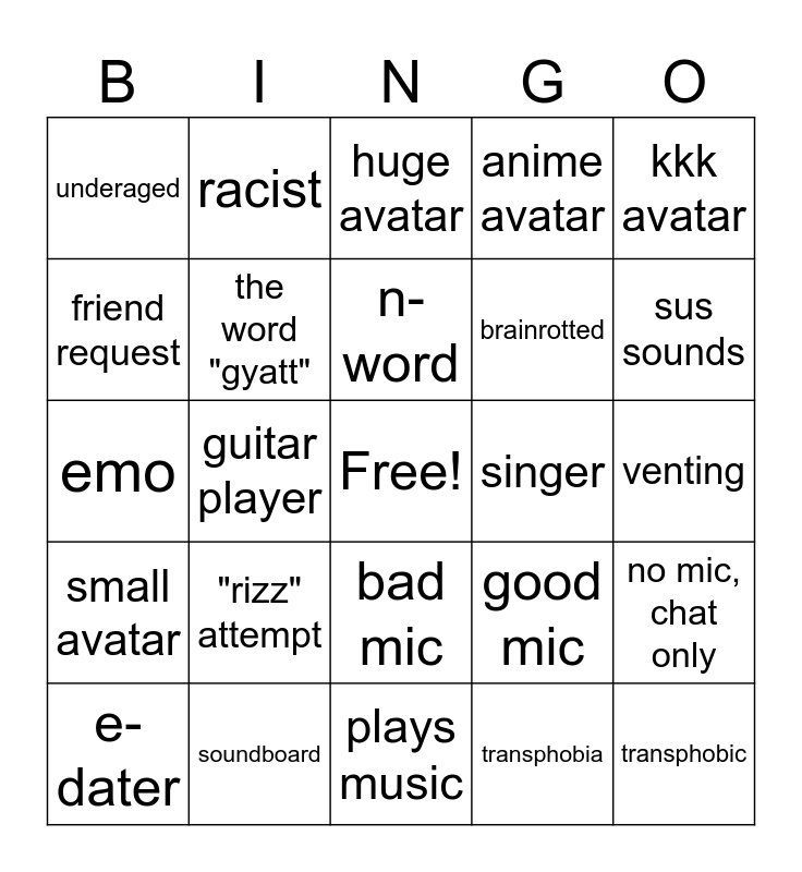 This bingo card has a free space and 24 words: e-dater, "rizz" attempt, n- word, transphobia, kkk avatar, underaged, racist, huge avatar, singer, venting, emo, the word "gyatt", good mic, no mic, chat only, friend request, soundboard, plays music, anime avatar, sus sounds, small avatar, guitar player, bad mic, brainrotted and transphobic.