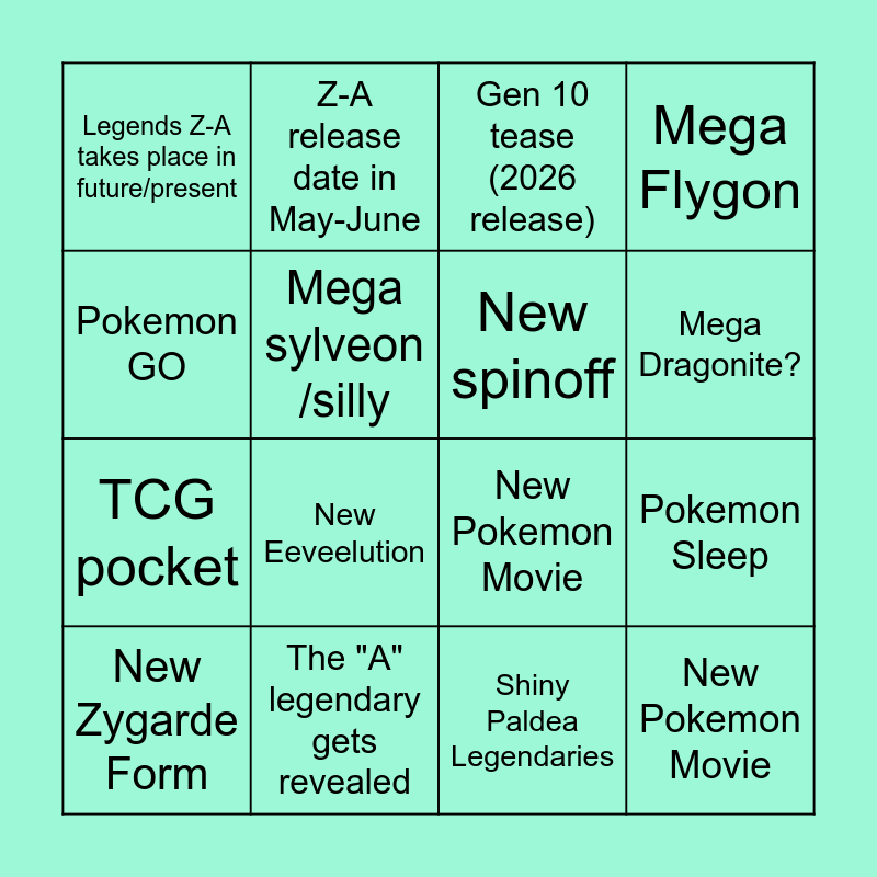 This bingo card has 18 words: New Eeveelution, New Pokemon Movie, Gen 10 tease (2026 release), Legends Z-A takes place in future/present, New Pokemon Movie, Mega Flygon, New Zygarde Form, Z-A release date in May-June, Mega Dragonite?, TCG pocket, Shiny Paldea Legendaries, Pokemon GO, Pokemon Sleep, Mega sylveon /silly, New spinoff, Obvious news on mobile games, The "A" legendary gets revealed and GBA ports.