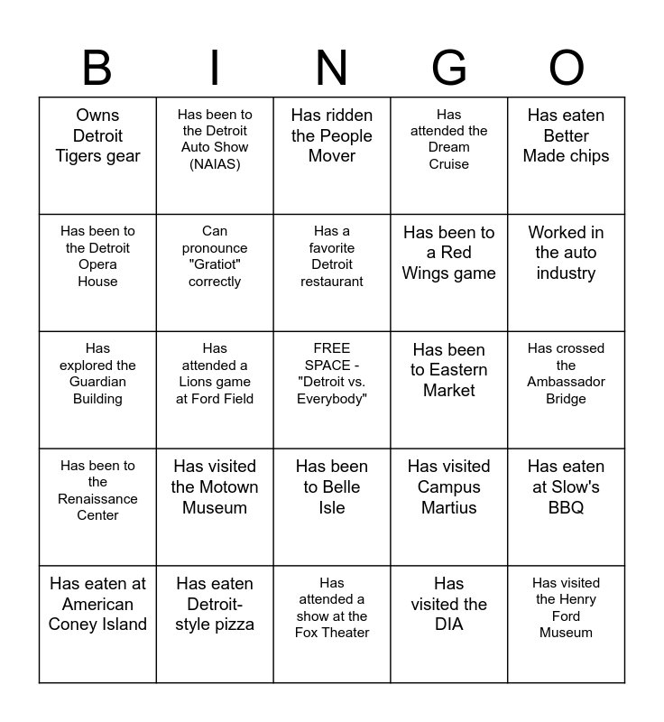 This bingo card has a free space and 29 words: Has eaten at American Coney Island, Can name a famous musician from Detroit, Has attended a Lions game at Ford Field, Has taken a photo with The Fist statue, Owns Detroit Tigers gear, Has ridden the People Mover, Can pronounce "Gratiot" correctly, Has visited the Motown Museum, Has been to Eastern Market, Has eaten Detroit-style pizza, Has crossed the Ambassador Bridge, Has visited the Henry Ford Museum, Has attended a show at the Fox Theater, Has visited the DIA, Worked in the auto industry, Has visited the Joe Louis Arena, Has been to Belle Isle, Has been to the Renaissance Center, Has eaten Better Made chips, Has explored the Guardian Building, Has visited Campus Martius, Can name 3+ Motown artists, Has been to a Red Wings game, Has been to the Detroit Opera House, Has attended the Dream Cruise, Has been to the Detroit Auto Show (NAIAS), Has eaten at Slow's BBQ, Has a favorite Detroit restaurant and Has attended a festival in Detroit.