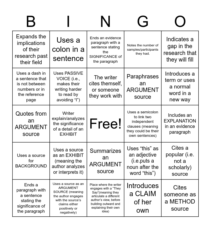 This bingo card has a free space and 24 words: Uses a source as an EXHIBIT (meaning the author analyzes or interprets it), Uses a source as an ARGUMENT SOURCE (meaning the author engages with the source’s claims either positively or negatively), The writer cites themself, or someone they work with, Ends a paragraph with a sentence stating the significance of the paragraph, Indicates a gap in the research that they will fill, Expands the implications of their research past their field, Uses a dash in a sentence that is not between numbers or in the reference page, Uses a colon in a sentence, Uses a semicolon to link two independent clauses (meaning they could be their own sentences), Summarizes an ARGUMENT source, Paraphrases an ARGUMENT source, Quotes from an ARGUMENT source, Uses “this” as an adjective (i.e.puts a noun after the word “this”), Cites a popular (i.e. not a scholarly) source, Uses PASSIVE VOICE (i.e., makes their writing harder to read by avoiding “I”), Introduces a CLAIM of her own, Includes an EXPLANATION in an evidence paragraph, Ends an evidence paragraph with a sentence stating the SIGNIFICANCE of the paragraph, Introduces a term or uses a normal word in a new way, Writer explain/analyzes the significance of a detail of an EXHIBIT, Cites someone as a METHOD source, Uses a source for BACKGROUND, Notes the number of samples/participants they had. and Place where the writer engages with a “They Say”(meaning they articulate a different author’s view, before building outward and explaining their own idea).