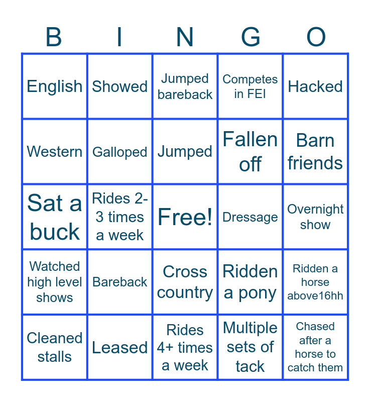 This bingo card has a free space and 24 words: Bareback, Leased, Jumped, Cleaned stalls, Hacked, English, Western, Showed, Dressage, Cross country, Fallen off, Sat a buck, Ridden a pony, Ridden a horse above16hh, Galloped, Multiple sets of tack, Overnight show, Jumped bareback, Barn friends, Rides 2-3 times a week, Chased after a horse to catch them, Watched high level shows, Competes in FEI and Rides 4+ times a week.
