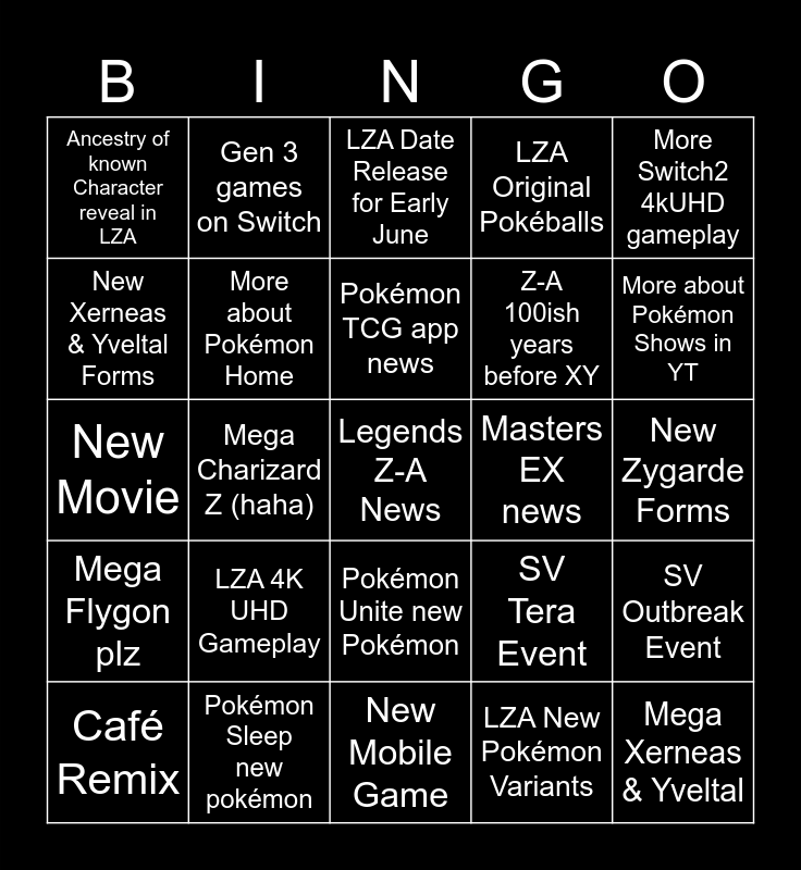 This bingo card has a free space and 24 words: LZA 4K UHD Gameplay, Pokémon Sleep new pokémon, Pokémon TCG app news, Café Remix, More Switch2 4kUHD gameplay, Ancestry of known Character reveal in LZA, New Xerneas & Yveltal Forms, Gen 3 games on Switch, Masters EX news, Pokémon Unite new Pokémon, Z-A 100ish years before XY, New Movie, SV Tera Event, SV Outbreak Event, More about Pokémon Home, LZA New Pokémon Variants, New Zygarde Forms, LZA Date Release for Early June, More about Pokémon Shows in YT, Mega Charizard Z (haha), Mega Xerneas & Yveltal, Mega Flygon plz, LZA Original Pokéballs and New Mobile Game.