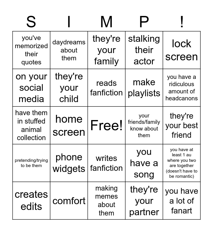 This bingo card has a free space and 24 words: phone widgets, comfort, reads fanfiction, creates edits, lock screen, you've memorized their quotes, on your social media, daydreams about them, your friends/family know about them, writes fanfiction, make playlists, have them in stuffed animal collection, you have a song, you have at least 1 au where you two are together (doesn't have to be romantic), they're your child, they're your partner, they're your best friend, they're your family, you have a ridiculous amount of headcanons, home screen, you have a lot of fanart, pretending/trying to be them, stalking their actor and making memes about them.
