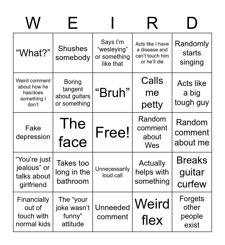 This bingo card has a free space and 32 words: Weird flex, Acts like a parent, The face, Unnecessarily rude, “You’re just jealous” or talks about girlfriend, Boring tangent about guitars or something, Randomly starts singing, Breaks guitar curfew, Shushes somebody, Complains about mom, “Bruh”, Says I’m “wesleying” or something like that, Calls me a magnet, Acts like he’s above me and Wes, Random comment about Wes, Talks about how much work he has, Financially out of touch with normal kids, Fake depression, Unnecessarily loud call, Takes too long in the bathroom, Actually helps with something, “I want to be back at Maple Park”, Random comment about me, The “your joke wasn’t funny” attitude, Forgets other people exist, Acts like I have a disease and can’t touch him or he’ll die, Calls me petty, Weird comment about how he has/does something I don’t, “What?”, Unneeded comment, Imitates me with a high pitched voice and Acts like a big tough guy.