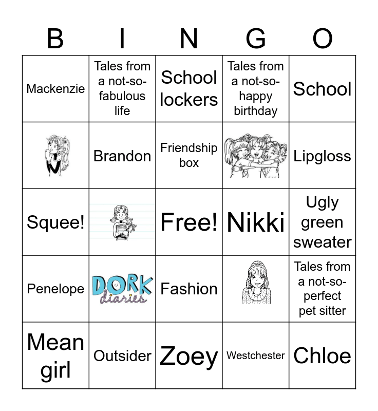 This bingo card has 6 images, a free space and 23 words: Mean girl, Brianna, Rachel Renee Russell, Mackenzie, School lockers, Brandon, Nikki, Outsider, Ugly green sweater, Chloe, Zoey, Westchester, Lipgloss, Library, Fashion, Penelope, School, Squee!, Tales from a not-so- happy birthday, Tales from a not-so- fabulous life, Tales from a not-so-perfect pet sitter, Friendship box and Brianna.