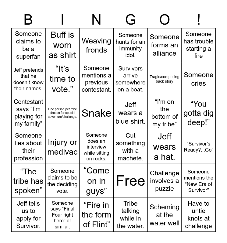 This bingo card has 42 words: Scheming at the water well, “It’s time to vote.”, “Nice Save” during a challenge, “I’m on the bottom of my tribe”, “Survivor’s Ready?...Go”, Injury or medivac, Contestant says “I’m playing for my family”, Talks about Survivor “bucket list”, Weaving fronds, “You gotta dig deep!”, Snake, Survivors arrive somewhere on a boat., Someone cries, Someone forms an alliance, Someone says “Final Four right here” or similar., Someone lies about their profession, Someone mentions the “New Era of Survivor”, Tragic/compelling back story, Have to untie knots at challenge, Buff is worn as shirt, Someone has trouble starting a fire, “Come on in guys”, “The tribe has spoken”, Someone claims to be a superfan, “You’re my number one.”, Jeff tells us to apply for Survivor., Someone mentions a previous contestant., Someone loses a vote., Someone claims to be the deciding vote., Challenge involves a puzzle, Someone complains that fellow tribe member is lazy., Jeff wears a blue shirt., Jeff pretends that he doesn’t know their names., Jeff wears a hat., “Fire in the form of Flint”, Someone does an interview while sitting on rocks., Cut something with a machete., One person per tribe chosen for special adventure/challenge., Free, Tribe talking while in the water., Someone hunts for an immunity idol. and Someone talks about watching Survivor as a kid..